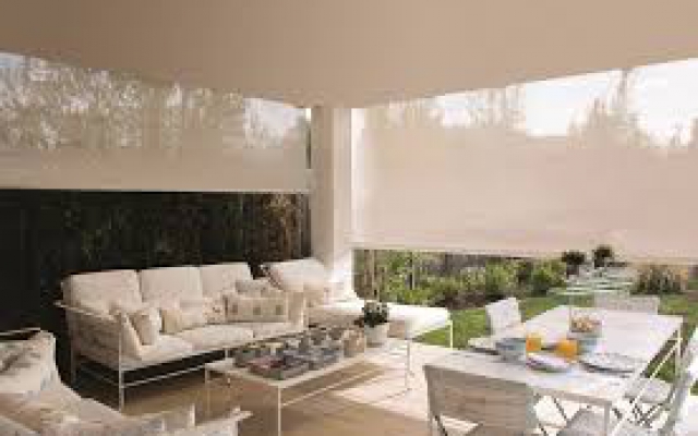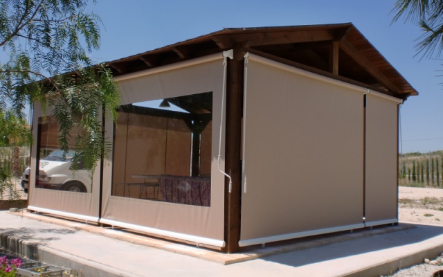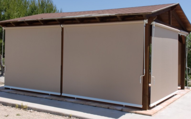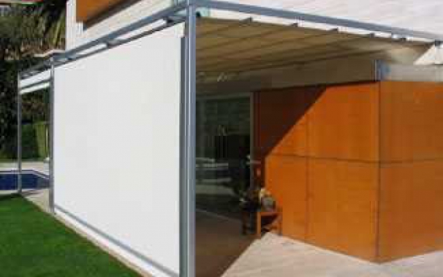 Sistema complementario para toldos planos como cerramiento vertical, con o sin guías laterales.